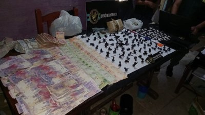 Luego inspeccionaron el domicilio, donde encontraron 39 envoltorios con una sustancia blanca tipo bochitas, la cual al realizar la prueba de campo dio como resultado 9 gramos de Cocaína; 81 envoltorios con una sustancia verde amarronada tipo bochitas que arrojaron un total de 122 gramos y un envoltorio de mayor tamaño tipo pan con la misma sustancia con un peso de 712 gramos ambos arrojaron resultado positivo a Marihuana. Además, hallaron varios recortes polietileno, tres teléfonos celulares y la suma de $ 89.480 pesos.