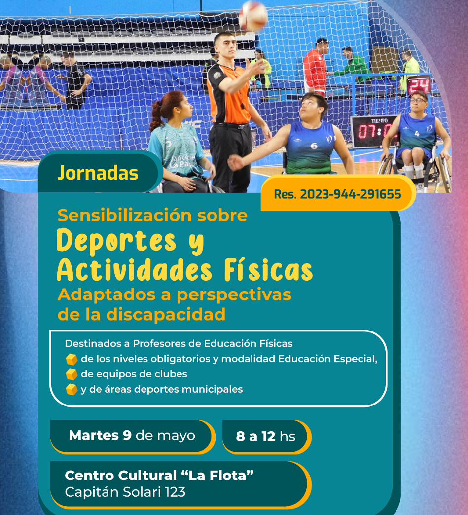 Se invita a participar de una “Jornada de sensibilización y actividades físicas adaptadas a perspectivas de la discapacidad”, a profesores de educación físicas de los niveles obligatorios y modalidades educación especial, de equipos de clubes, y de áreas de deportes municipales. Dicho encuentro se va a concretar desde la Dirección de