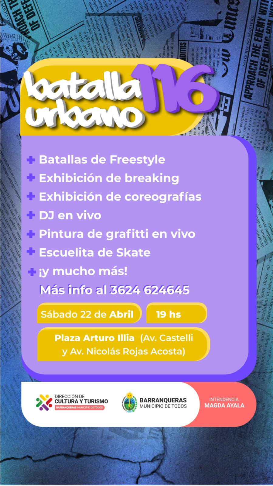 De modo que, a partir de las 19 horas en la Plaza Arturo Illia (avenida Castelli y avenida. Nicolás Rojas Acosta) el día sábado 22 de abril habrá batallas de freestyle, exhibición de breaking, DJ en vivo, pintura de grafitti, exhibición de coreografías, escuelita de Skate y mucho más.