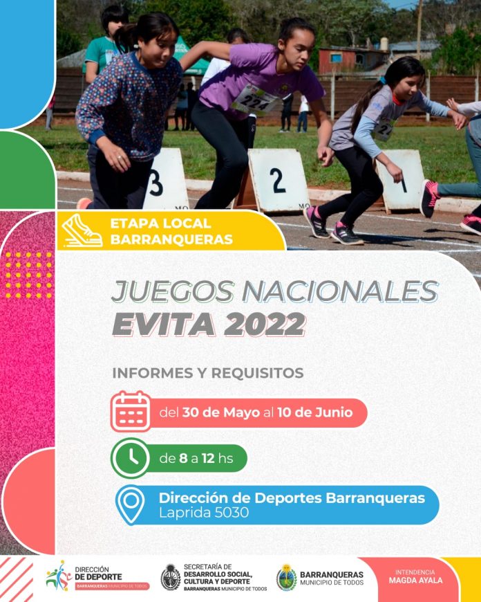 Desde la Dirección de Deportes de la Municipalidad de Barranqueras, se informa que a partir del 30 de mayo y hasta el 10 de junio es el periodo para solicitar informes y requisitos quienes estén interesados en participar de la etapa local de los Juegos Nacionales Evita 2022. Por lo mismo, pueden acercarse desde el lunes 30 de lunes a viernes de 8 a 12 horas en Av. Laprida 5030.