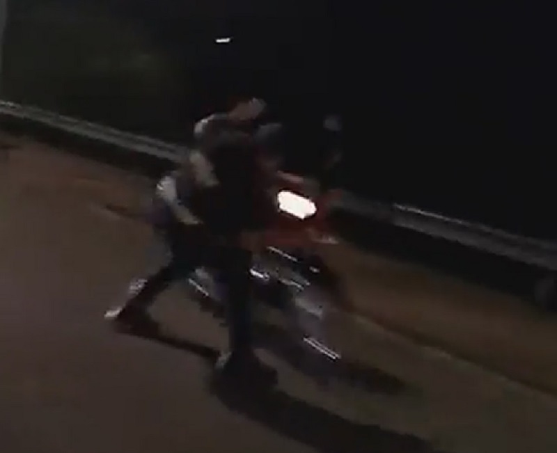 En el breve video (dura unos 30 segundos) se observa que una persona vestida con chaleco de seguridad impactó con un palo a un motociclista. El hombre perdió el control del vehículo y, unos 20 metros más adelante, se estrelló contra el asfalto.