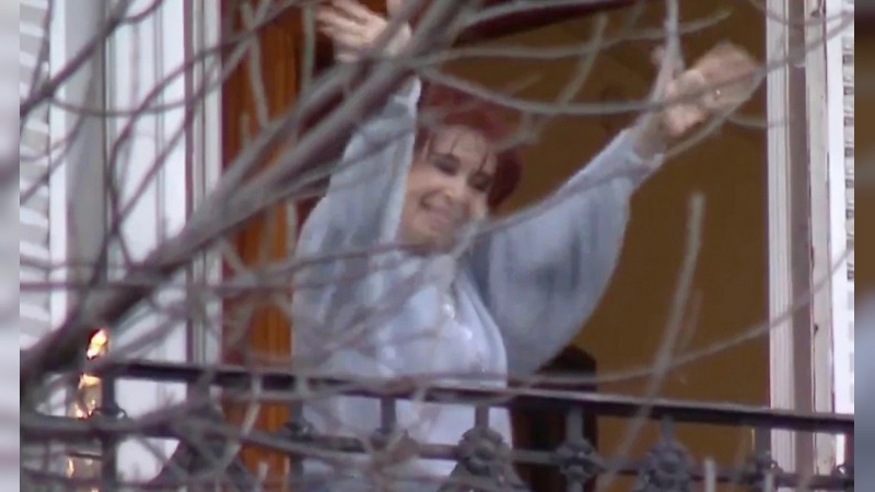 La expresidenta Cristina Kirchner volvió a asomarse al balcón de su departamento en San José 1111, barrio de Constitución, para saludar a los cientos de militantes que, desafiando el frío, se acercaron este domingo a manifestarle su apoyo y repudiar la condena confirmada por la Corte Suprema.