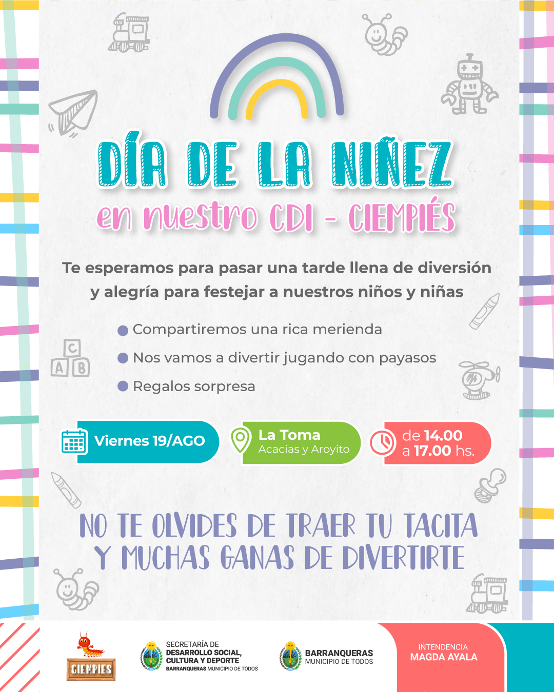 Para festejar las infancias junto con los niños y niñas de la localidad, el Centro de Desarrollo Infantil “CIEMPIÉS” del Municipio de Barranqueras desplegará este viernes, de 14 a 17hs, un gran festejo por el Día de la Niñez en su edificio en el Barrio La Toma, en calle Acacias y Aroyitos, donde se compartirá la merienda, diferentes actividades y juegos con payasos y regalos sorpresa.