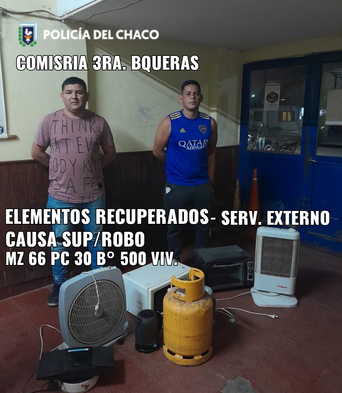 Este lunes en horas de la noche personal del servicio externo de la comisaría Tercera Barranqueras al realizar tareas investigativas en base a causa “SUP. ROBO” que damnifica a un ciudadano de 78 años quien da cuenta que desde su domicilio le habrían sustraído varios artefactos.