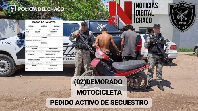 Seguidamente procedieron a verificar las numeraciones de motor y cuadro de la motocicleta ZANELLA ZB 110cc, dominio colocado, de color Roja, sin llave de ignición, constatando que el rodado tenia pedido activo de secuestro, desde el día 27/11/2023, en Causa Sup. ROBO a cargo de la fiscalía N°13, a solicitud de Comisaría 8va.