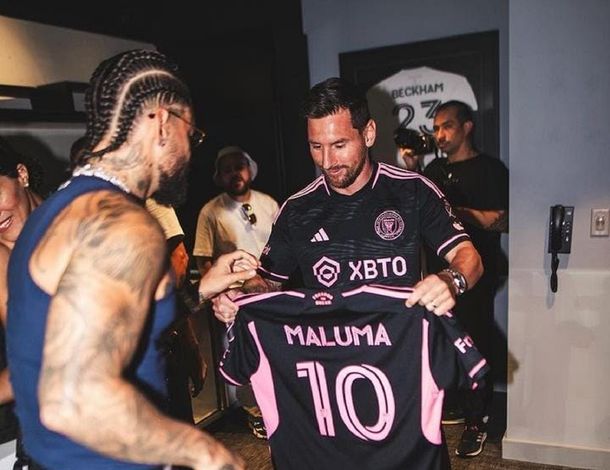 En plena gira denominada Don Juan World Tour, el artista latino está recorriendo Estados Unidos y realizó una parada en el DRV PNK Stadium para poder encontrarse con el capitán de las Garzas. Vestido con la camiseta negra de la franquicia que lo cobijó recientemente, Leo le consultó a Maluma: “¿Negro o rosa?”, en referencia a las dos remeras que llevó para que luzca su invitado.