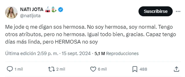 Ante las respuestas que estaba recibiendo, la influencer publicó un polémico tweet en su cuenta de X difiriendo de los comentarios sobre su persona: “Me jode que me digan sos hermosa”. No soy hermosa, soy normal. Tengo otros atributos, pero no hermosa. Igual todo bien, gracias. Capaz tengo días más linda, pero HERMOSA no soy”.
