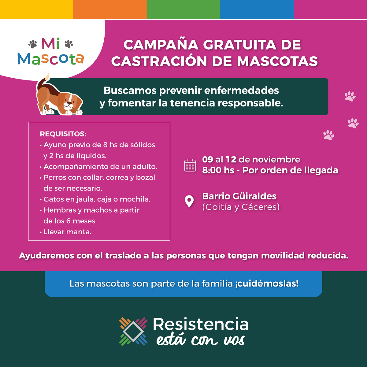 El Municipio de Resistencia continúa con la campaña gratuita de castración de mascotas este martes en el barrio Güiraldes