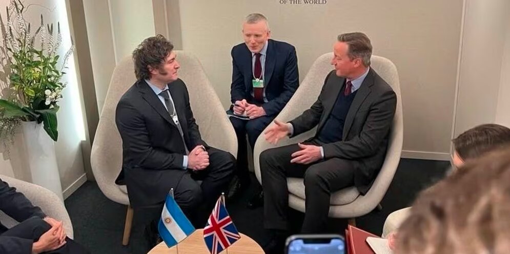 “El Presidente Javier Milei mantuvo un encuentro con el Secretario de Estado para las Relaciones Internacionales del Reino Unido, David Cameron, en Davos. También participó de la reunión la Canciller argentina, Diana Mondino”, publicó esta mañana la cuenta en la plataforma X (antes Twitter) de la “Oficina del Presidente”, por la cual se difunden habitualmente las actividades del jefe de Estado argentino.