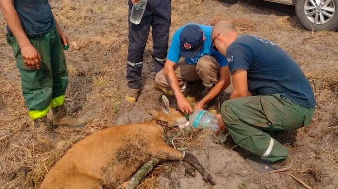 En las últimas horas, Tomás Miguel Cura, bombero voluntario de Las Saladas, publicó en su cuenta de Facebook imágenes desgarradoras de un ciervo del pantano con las patas quemadas.