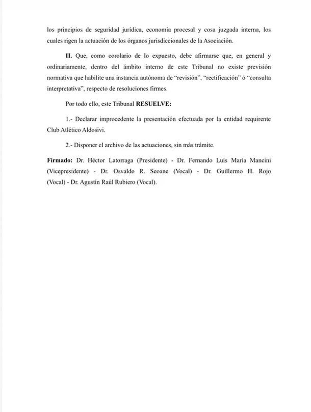 En primera instancia, el “Tomba” había recibido una sanción de quita de seis puntos (tres por cada encuentro). Sin embargo, el Tribunal de Apelaciones de la AFA decidió restituirle las unidades semanas más tarde. Aldosivi consideró que existió un error de procedimiento en esa devolución y solicitó una revisión extraordinaria, algo que ahora fue definitivamente desestimado.