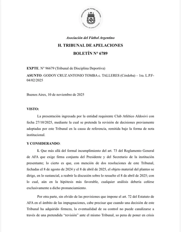 El Tribunal de Disciplina de la Asociación del Fútbol Argentino (AFA) resolvió rechazar el pedido presentado por Aldosivi de Mar del Plata para que se le quiten puntos a Godoy Cruz de Mendoza, en el marco de la lucha por la permanencia en Primera División. Según consta en el fallo fechado el 10 de noviembre, el Tribunal declaró improcedente la solicitud del club marplatense y dispuso el archivo de la causa, poniendo fin al reclamo.