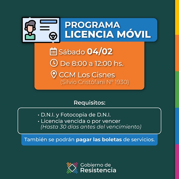 Este sábado 4 de febrero, los programas municipales “Mi licencia móvil” y “Mi Primera Licencia” se presentarán en el Centro Comunitario Municipal del barrio “Los Cisnes”, de 8 a 12 horas, sito en calle Silvio Cristófani 1.950.