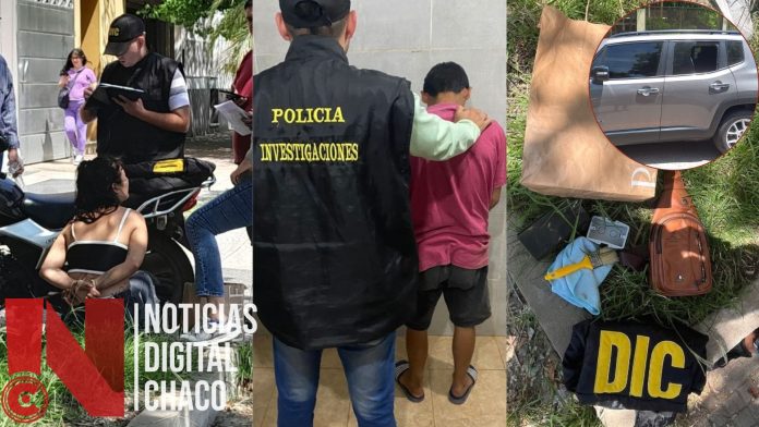 Este jueves cerca de las 11:35 horas, efectivos de la División Delitos Contra la Propiedad detuvieron a una mujer de 32 y un hombre de 31 años quienes habrían sustraído una bandolera del interior de un Jeep en Avenida 9 de julio y calle San Lorenzo en la capital chaqueña.