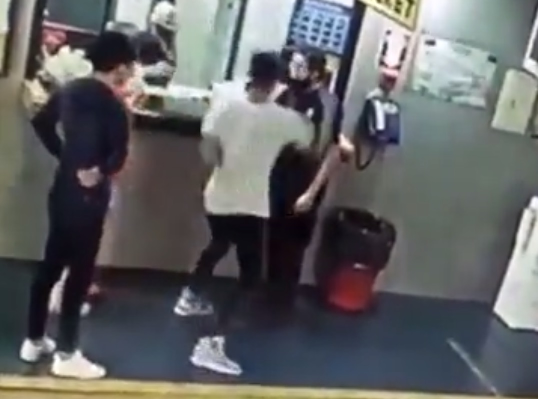En el inicio del video, se ve a estos tres últimos hablando con el playero, quien se acerca al lugar donde se encontraba la mujer y mientras habla con ella, uno de los jóvenes le dio un fuerte golpe en la cara, tras lo cual el empleado cayó inconsciente al piso.