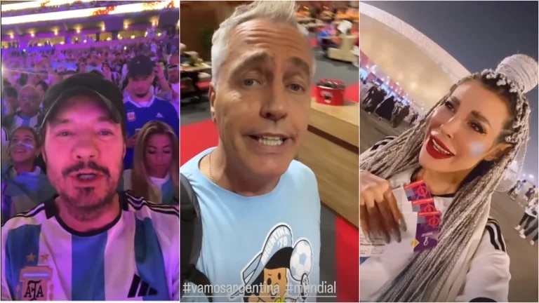 Por la noche qatarí, los tres se enfundaron en la celeste y blanca para alentar a Scaloni y sus muchachos como en los cinco partidos anteriores. Sonrientes y efusivos, el conductor registró el acceso al estadio entre saltos, gritos de alientos y plegarias. “Un pasito más, Selección, vamos carajo”, expresó el hombre de Bolívar, que luego mostró el color y el calor del público argentino.
