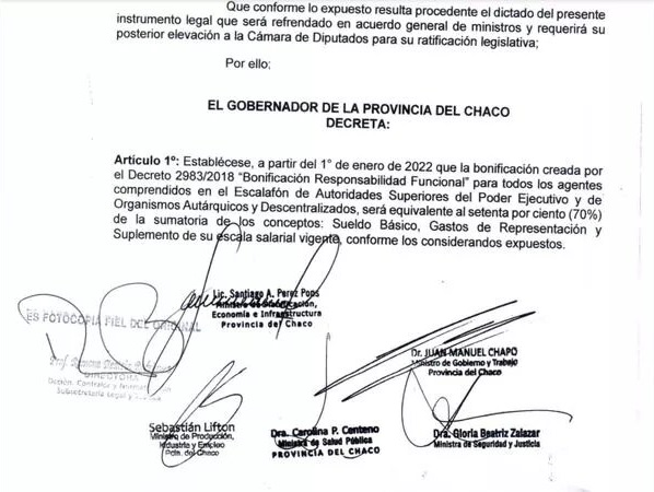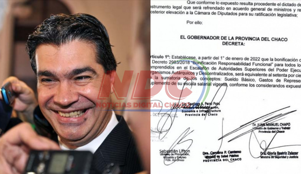 Surge de un decreto que él mismo firmó el pasado 14 de enero incrementando la bonificación por “Responsabilidad Funcional” para todas las autoridades superiores del Poder Ejecutivo y organismos autárquicos y descentralizados. Se trata de un ítem creado por su antecesor Domingo Peppo en noviembre de 2018.