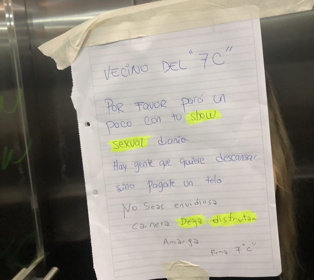Resulta que el muchacho que vive en el 7C de este lugar desconocido posiblemente se levantó un día, se vistió y encaró hacia afuera para sus actividades diarias. Llamó el ascensor, entró y para su sorpresa, había un papel pegado con mucha malicia que decía lo siguiente: “Vecino del 7C, por favor, pará un poco con tu show sexual diario. Hay gente que quiere descansar. Sino pagate un telo”, redactó la misiva.