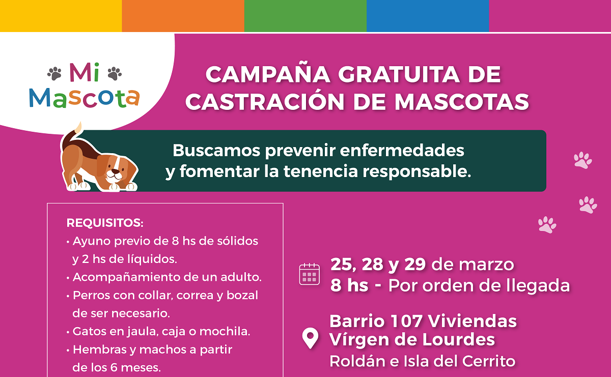 El programa municipal “Mi Mascota” que consiste en la castración gratuita de perros y gatos, estará presente en el barrio 107 Viviendas, Virgen de Lourdes, en la intersección de las calles Roldan e Isla del Cerrito.