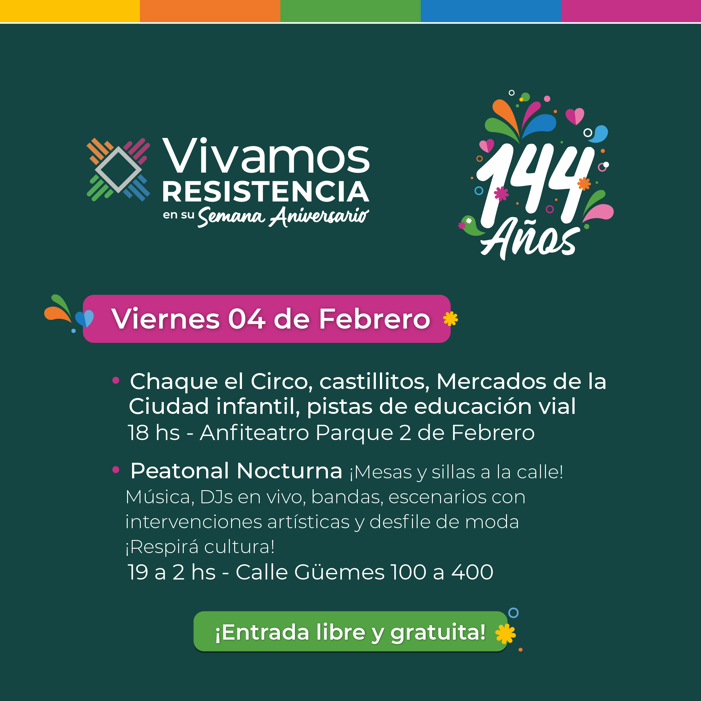 A las 19 horas y hasta las 2 de la madrugada del día siguiente, sobre la calle Güemes desde la altura 100 al 400 se la utilizará como Peatonal Nocturna, donde habrá sillas y mesas en las calles de ese sector comercial de la capital chaqueña. Allí también habrá música, DJs en vivo, bandas, escenarios con intervenciones artísticas y desfiles de moda.