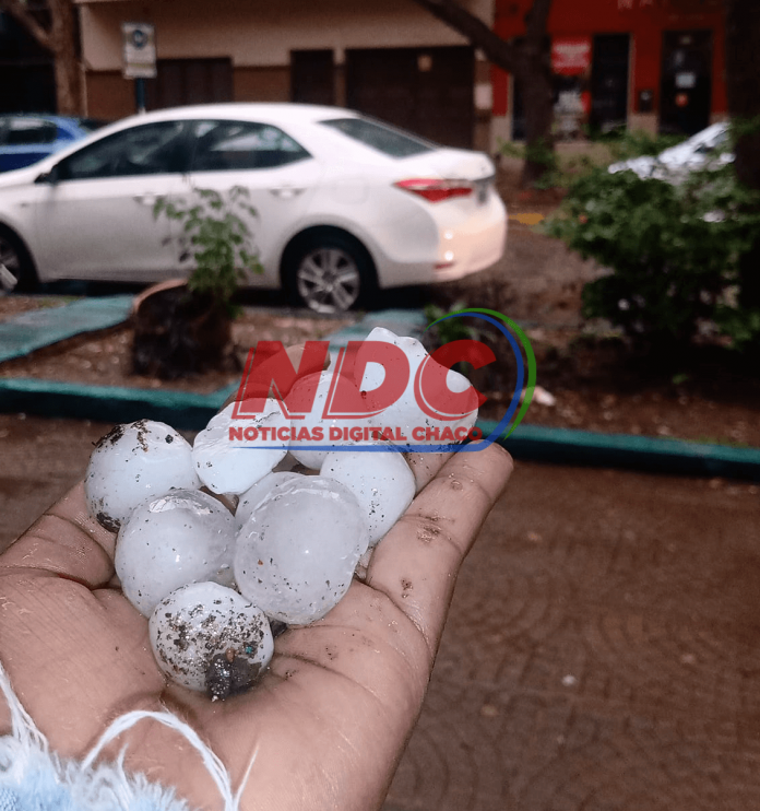 En este contexto, pasadas las 18 de este jueves, se produjo caída de granizo en algunos barrios de la capital chaqueña, con “piedras” de distintas dimensiones.