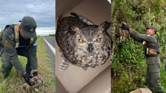 Cuando el personal arriba al lugar constata la presencia de un “Gran Búho Cornudo” que se encontraba desorientado, pero en buen estado de salud.