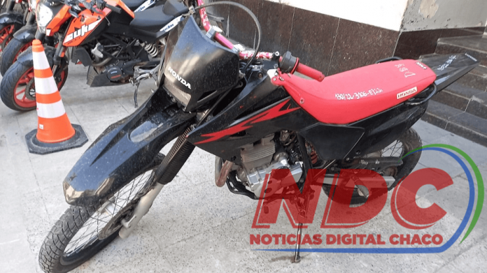 La moto honda, modelo tornado, 250cc, color roja (pintada para evadir los controles color Negro ) fue encontrada en Av. Sarmiento a la altura Nº 5.200-Rcia en la cual se movilizaban dos personas masculinas a quienes, al intentar realizar el control sobre el rodado e identificar a los ocupantes, los mismos se percatan de la presencia policial y dejan abandonado el rodado, ingresando los sujetos a un campo aledaño perdiéndose de vista entre las malezas, no logrando su identificación.