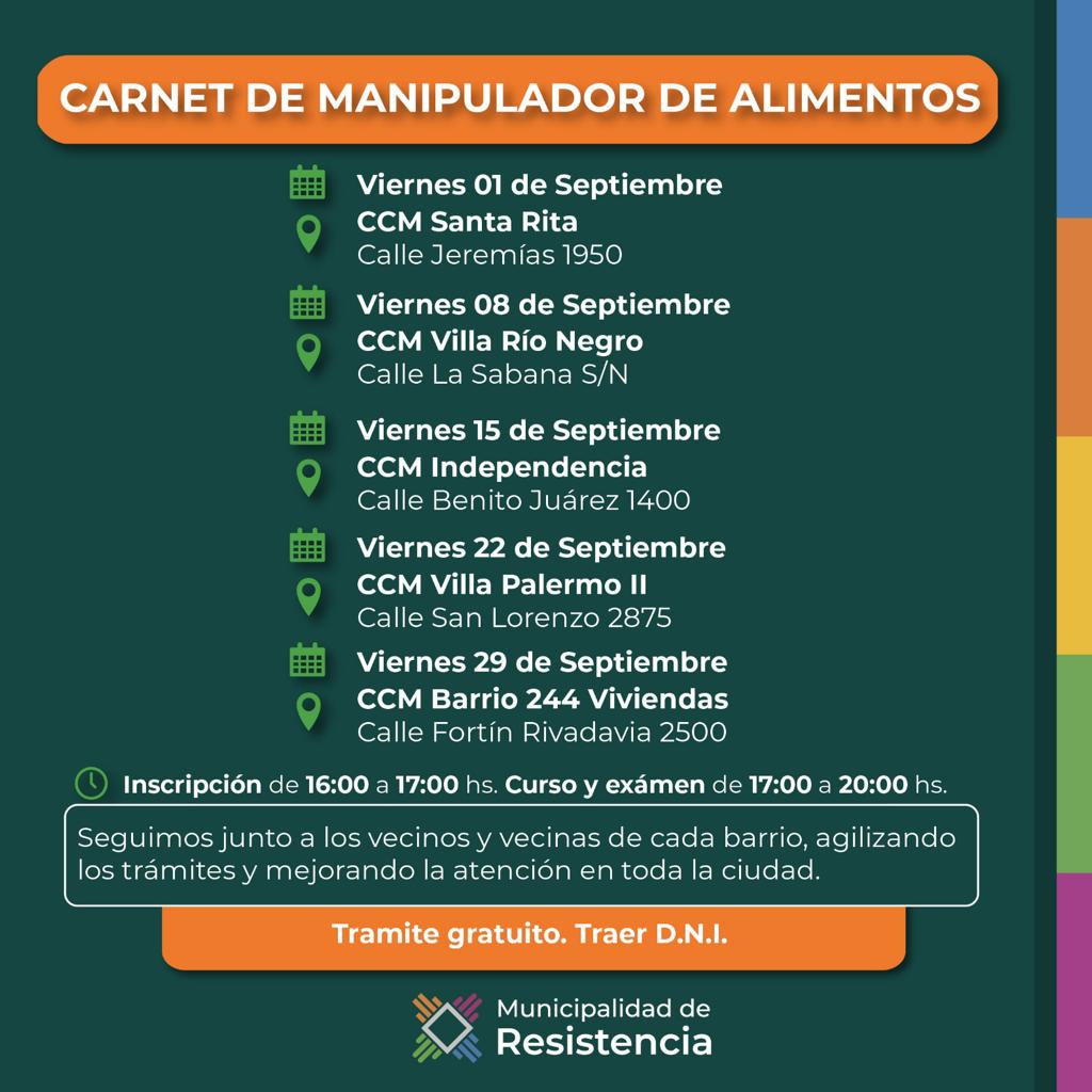 La Municipalidad de Resistencia informó que el proceso de obtención del carnet habilitante para manipuladores de alimentos tendrá su primera fecha del mes este viernes 1, desde las 16, en el Centro Comunitario Municipal del barrio Santa Rita.