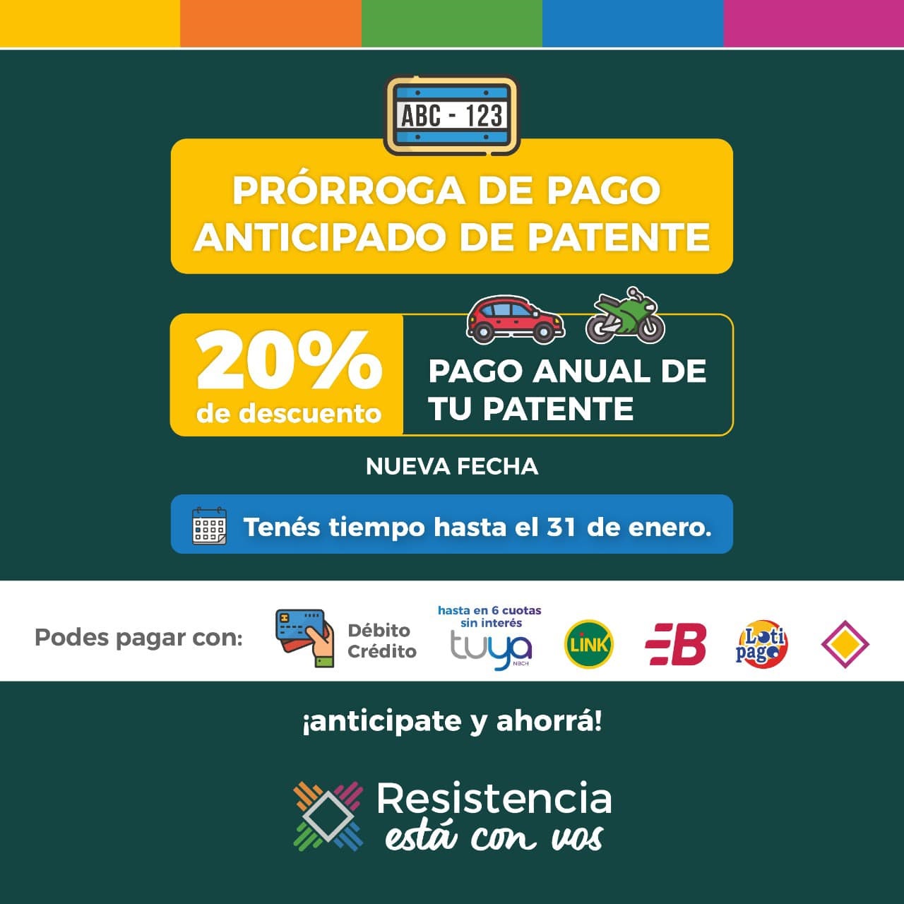 La Municipalidad de Resistencia recuerda que hasta el 31 de Enero hay tiempo para realizar el pago de patente anual anticipado