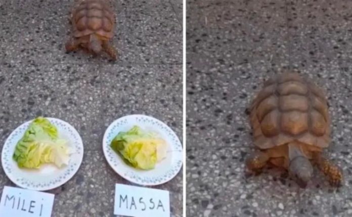 En este caso, las opciones fueron los nombres de los candidatos de Unión por la Patria y La Libertad Avanza. Rumbo al balotaje, la tortuga le puso mucho suspenso pero finalmente se decidió y eligió el plato “ganador”. ¿Volverá a acertar?
