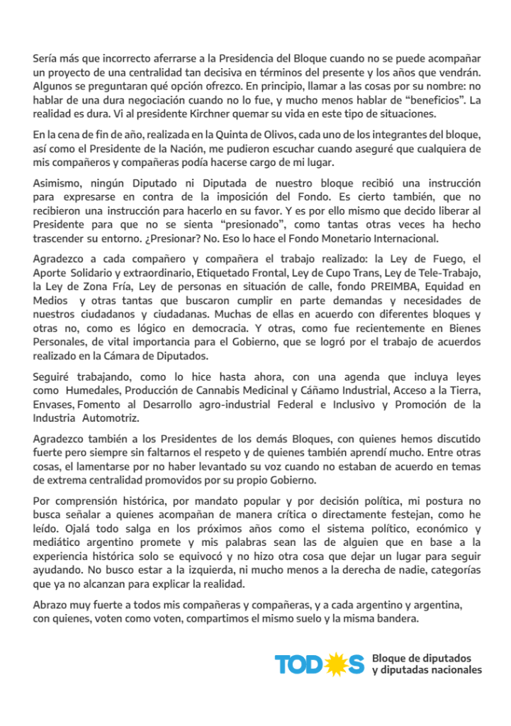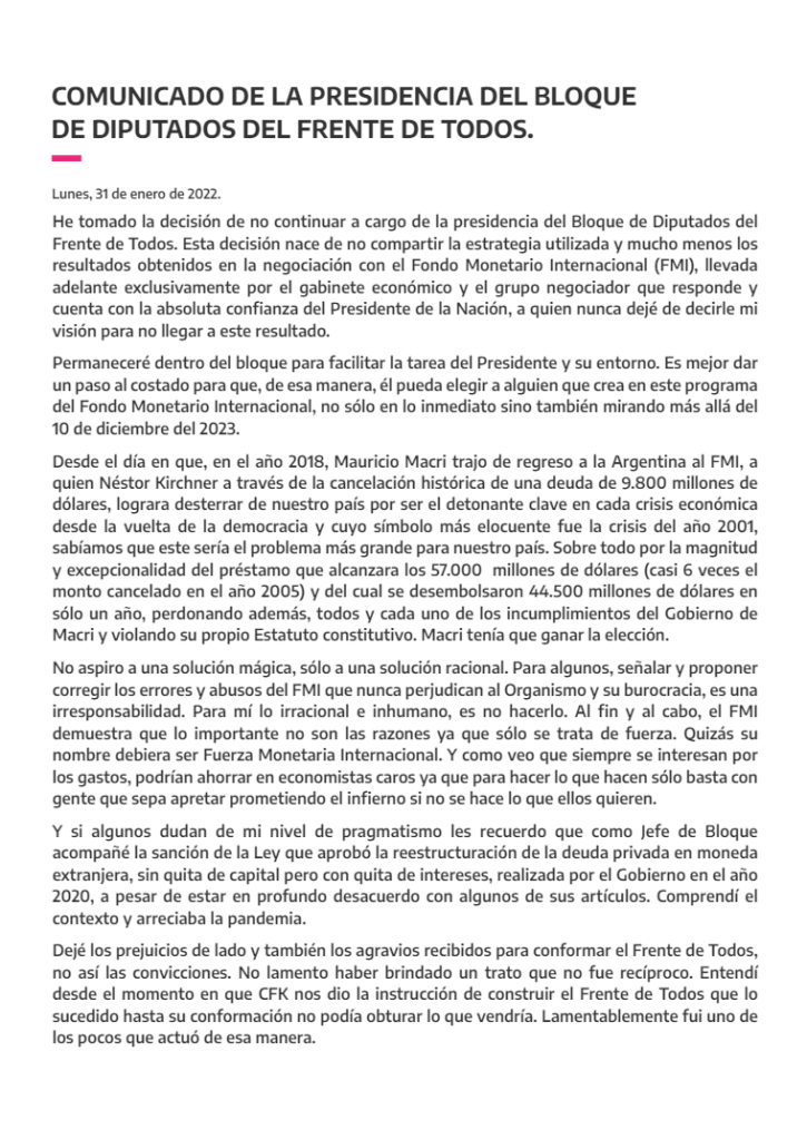 “He tomado la decisión de no continuar a cargo de la presidencia del bloque de diputado del Frente de Todos. Esta decisión nace de no compartir la estrategia utilizada y mucho menos los resultados obtenidos en la negociación con el Fondo Monetario Internacional (FMI), llevada adelante exclusivamente por el gabinete económico y el grupo negociador que responde y cuenta con la absoluta confianza del Presidente de la Nación, a quien nunca dejé de decirle mi visión para no llegar a este resultado”, dijo Kirchner en un comunicado.