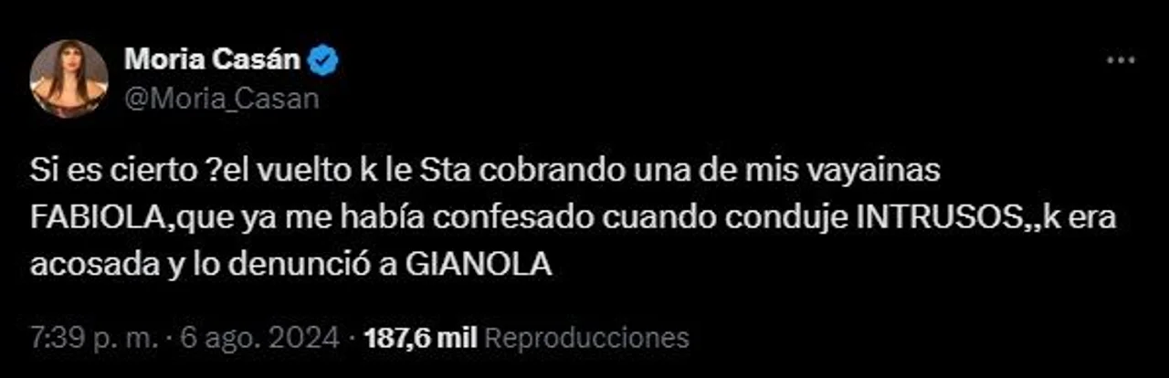 Moria Casán publicó en su cuenta de X un tweet en referencia a la denuncia de Yañez a Fernández: “¿Si es cierto? El vuelto que le está cobrando una de mis vayainas Fabiola” y agregó: “Ya me había confesado, cuando conduje Intrusos, que era acosada y lo denunció a Fabián Gianola”, reveló.