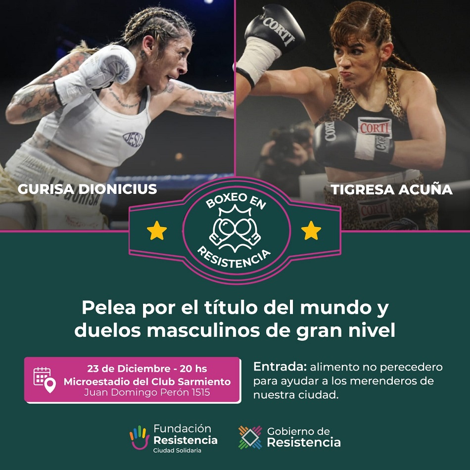 El Municipio invita a toda la comunidad a la pelea revancha por un título mundial que protagonizará, este viernes 23 de diciembre, Marcela “Tigresa Acuña” contra Débora “La Gurisa” Dionicius. El evento boxístico será en el microestadio del Club Sarmiento, desde las 20, y la entrada será un alimento no perecedero para comedores de la capital chaqueña.