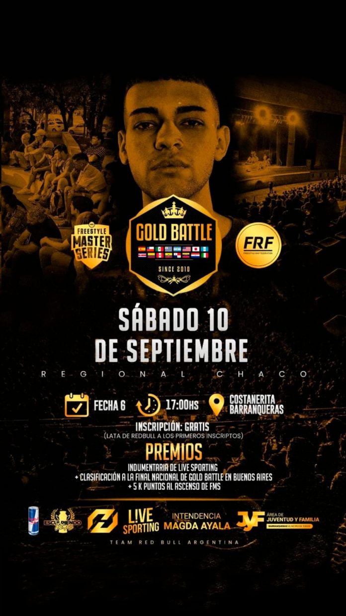 La ciudad portuaria vuelve a ser sede del encuentro denominado Esculpiendo Rimas en su sexta fecha. Un evento que dará inicio a las múltiples actividades por el Mes de la Juventud que se llevaran adelante la Municipalidad de Barranqueras a través del área de Juventud y Familia dependiente de la Secretaría de Desarrollo Social. La cita es este sábado 10 de septiembre a las 17 horas en la Costanerita (Chile y Laprida). La inscripción para ésta etapa regional del Gold Battle es totalmente gratuita y se realizará en el lugar y horario de encuentro.