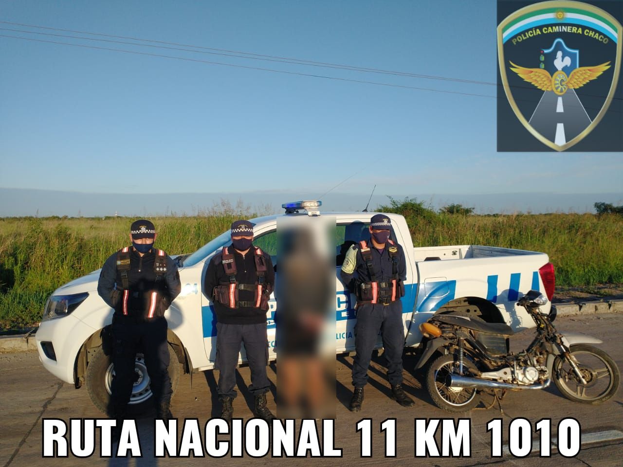 Fue interceptado sobre ruta N° 11 km 1010 mientras circulaba en una motocicleta marca Motomel Blitz de 110 cc, que más tarde, de averiguaciones realizadas, se determinó que fue sustraída en Colonia Benítez.