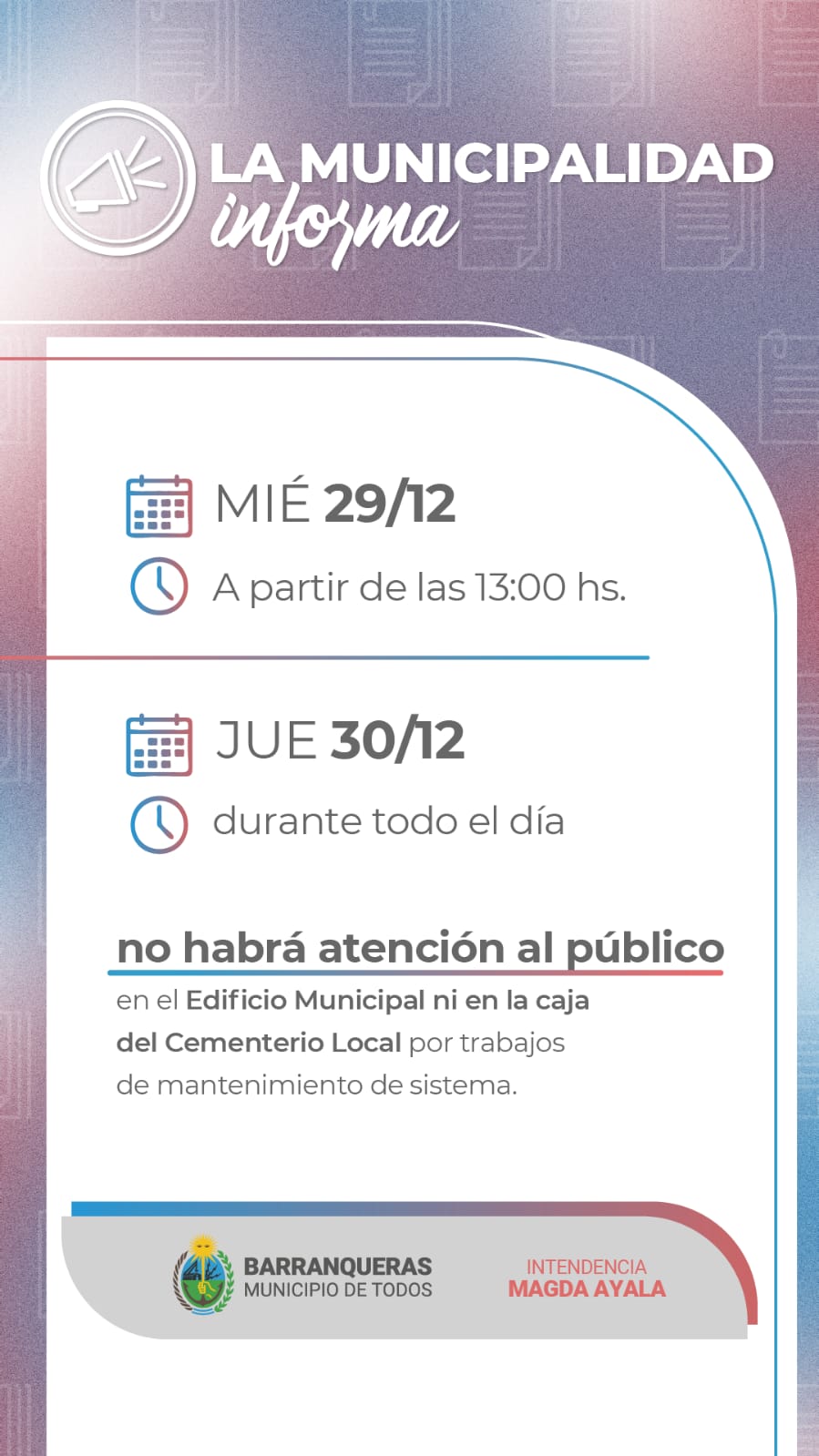 HomeMunicipalidad de BarranquerasPor trabajos de mantenimiento de sistema, no habrá atención al público en...