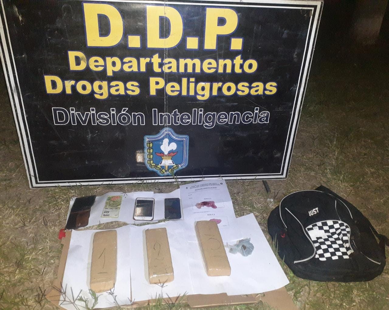 Por tal motivo, realizaron la prueba de campo arrojando como resultado, marihuana con un peso de 1968 gramos. Además, incautaron dos celulares, $500 y la motocicleta.