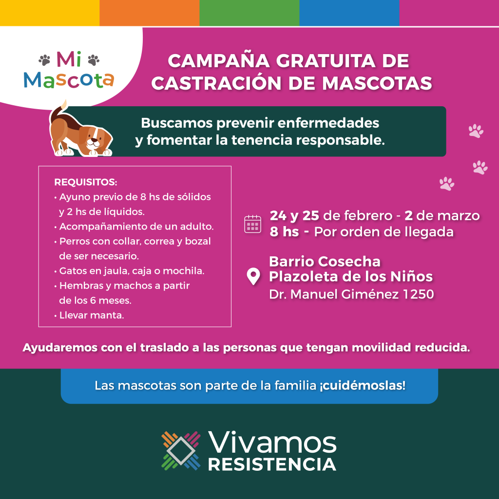 El operativo de castración de mascotas se desplegará este jueves y viernes, 24 y 25 de febrero y miércoles 2 de marzo, desde las 8 en la Plazoleta de los Niños, ubicada en Doctor Manuel Giménez al 1250 del barrio Cosecha, en el marco del programa Mi Mascota.