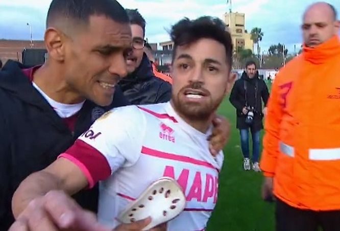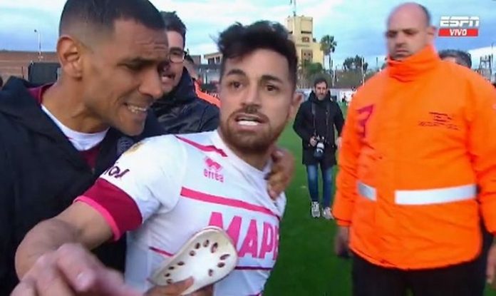 Una veza finalizado el encuentro, el polémico delantero de Lanús invitó a pelear a medio plantel de Barracas y se sacó de encima una cámara TV de muy mala manera.