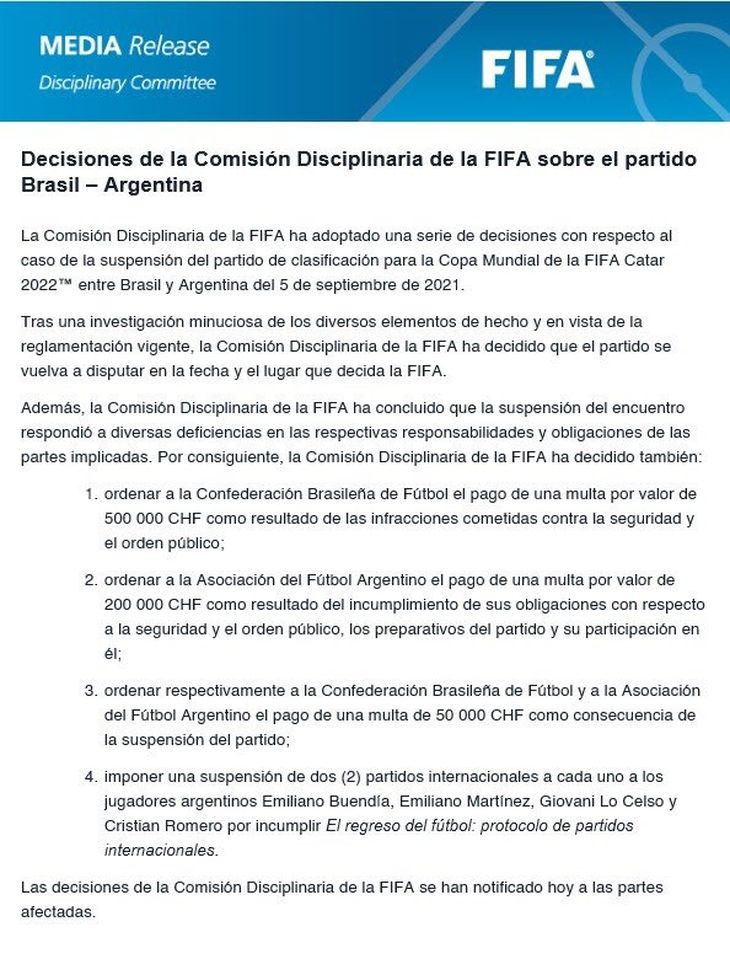 Además, informaron multas para ambo seleccionados y suspender a los jugadores argentinos Emiliano Buendía, Emiliano Martínez, Giovani Lo Celso y Cristian Romero por dos partidos cada uno “por no cumplir con el Protocolo de Partidos Internacionales de Regreso al Fútbol de la FIFA”.