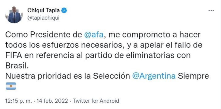 Tras conocerse el comunicado por la suspensión del partido, el presidente de la AFA Claudio “Chiqui” Tapia informó que la entidad iba a apelar al fallo de la FIFA.