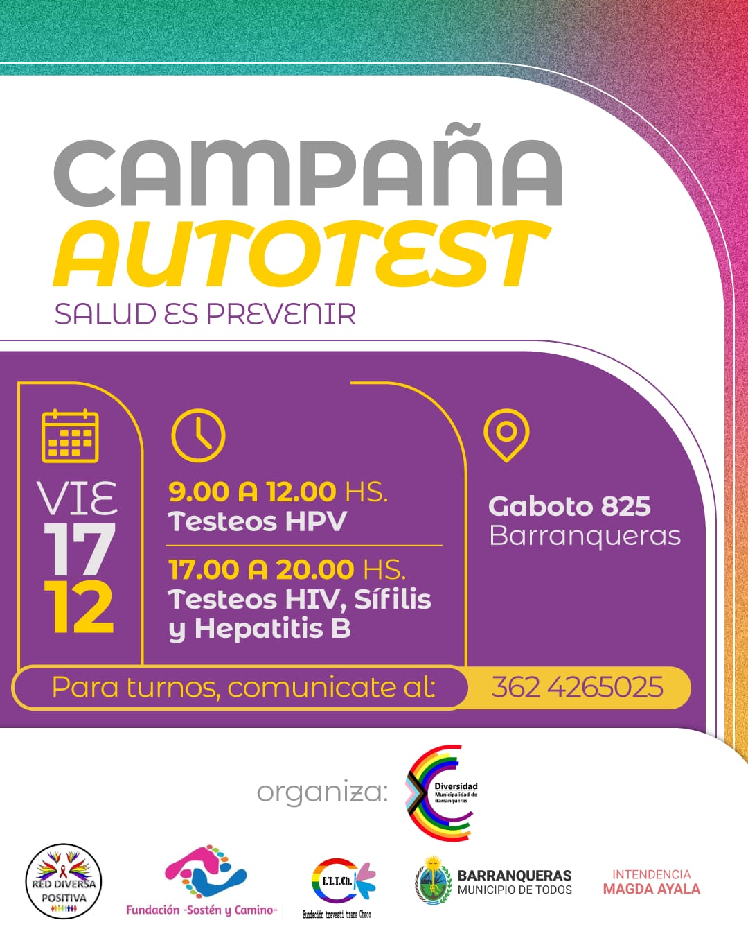 Este viernes en la calle Gaboto 825, de 9 a 12hs, se realizarán testeos de HPV, mientras que de 17 a 20, en la misma dirección, serán los de HIV, Sífilis y Hepatitis B. Esta campaña de salud, que busca a través de los autotesteos, la detección de los diferentes virus, está articulada desde el área de Diversidad del Municipio, en conjunto con la Red Diversa Positiva, Fundación Sostén y Camino y Travesti y Trans del Chaco.