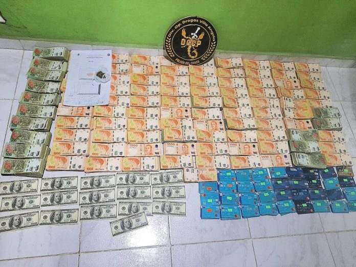 Al llegar a la vivienda ubicada en Pasaje Publico entre calle Maipu y Avenida Menem, encontraron a los investigados, un hombre de 30 años y una mujer de 24, a quienes le pusieron en conocimiento la medida judicial de registro en busca de estupefacientes, la cual, dio resultado positivo al encontrar un envoltorio con 4,4 gramos de marihuana y también, muchos fajos de billetes separados con banda elástica, contabilizando un total de 10 millones cien mil pesos, 261 tarjetas de débito de Banco del Chaco y Banco Nación, 58 cédulas DNI y 2.500 dólares.