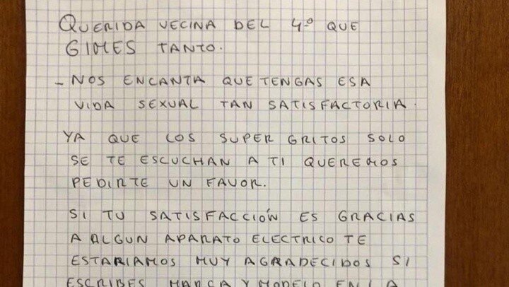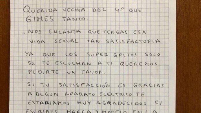 “Querida vecina del cuarto que gimes tanto. Nos encanta que tengas esa vida sexual tan satisfactoria”, arranca de manera contundente el escrito, que ya daba algunas pistas de lo que sería la carta viral.