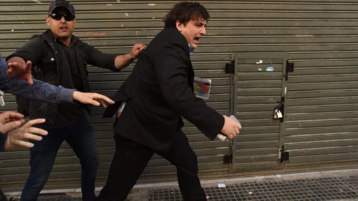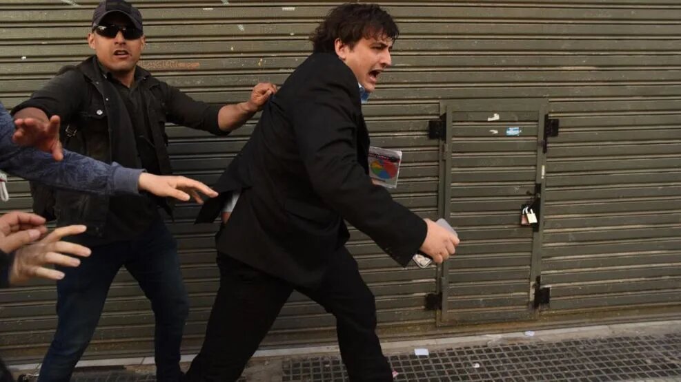 Aproximadamente 45 minutos después de la votación, un grupo de manifestantes lo identificó en medio de la marcha. Esto desencadenó una serie de incidentes violentos, ya que lo consideraron como una provocación de parte del libertario.