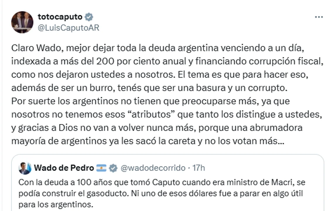 En respuesta, Caputo utilizó su cuenta oficial de X (@LuisCaputoAR) para lanzar un mensaje contundente: “Claro Wado, mejor dejar toda la deuda argentina venciendo a un día, indexada a más del 200 por ciento anual y financiando corrupción fiscal, como nos dejaron ustedes a nosotros. El tema es que para hacer eso, además de ser un burro, tenés que ser una basura y un corrupto”.