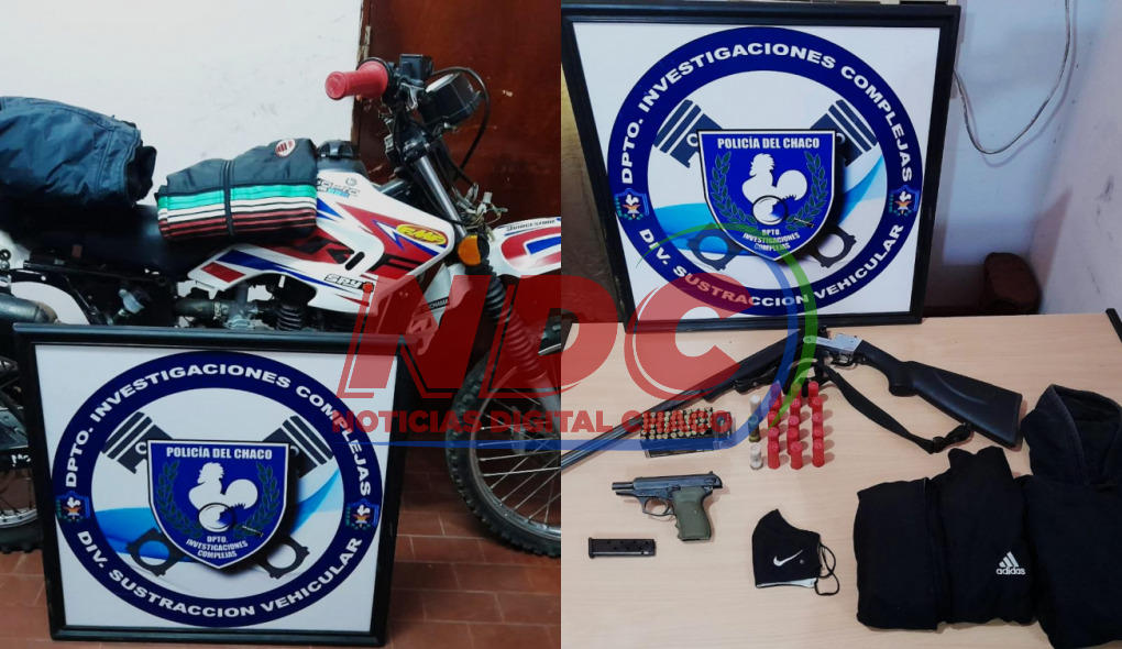 Efectivos de la División Sustracción vehicular secuestraron (1) PISTOLA, marca BERSA, modelo COMBAT, calibre 380, serie Nro. E92207, pavonado negro, c/UN cargador conteniendo OCHO cartuchos mismo calibre, (1) CAJA conteniendo CUARENTA Y DOS (42) CARTUCHOS CALIBRE 380, (3) BUZOS con capucha color negro, (1) CAMPERA tipo rompeviento color negro, (1) BARBIJO color negro, (1) MOTOCICLETA, tipo cross, marca MOTOMEL, 125, llantas a rayos, color blanco y rojo, s/dominio colocado.-