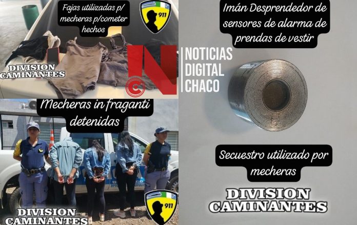 Seguidamente, policial femenino se dirigió a lugar y logró interceptar a las sospechosas en la calle Santa María de Oro al 155. Durante el cacheo, descubrieron que cada una de ellas llevaba fajas elásticas en el abdomen, utilizadas para ocultar las prendas, una técnica comúnmente asociada a las “mecheras”.