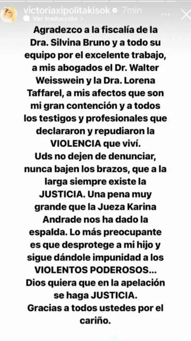 A pesar de la sentencia desfavorable, la modelo agradeció todo el apoyo que recibió en este tiempo. “Agradezco a la fiscalía de la Dra. Silvina Bruno y a todo su equipo por el excelente trabajo. A mis abogados el Dr. Walter Weisswein y la Dra. Lorena Taffarel. A mis afectos que son la gran contención y a todos los testigos y profesionales que declararon y repudiaron la violencia que viví”, escribió en Instagram.