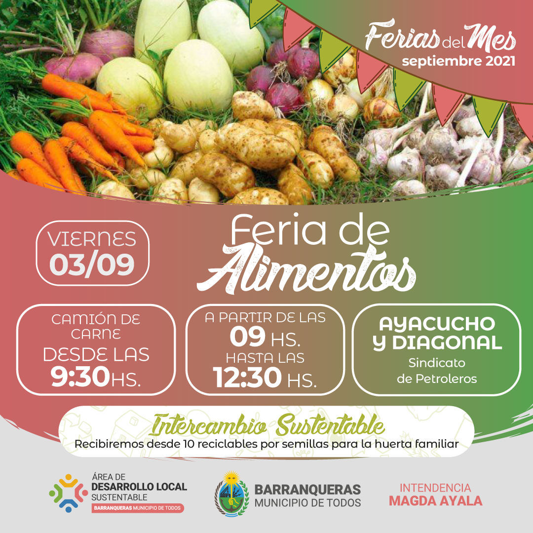 El Área de Desarrollo Local y Sustentable en un trabajo en conjunto con diferentes áreas del Municipio de Barranqueras, desplegará una nueva “Feria de Alimentos” como lo viene haciendo cada semana. En esta oportunidad será sobre la vereda del Sindicato de Petroleros, en la intersección de Ayacucho y Diagonal Eva Perón, de 9 a 12:30hs, respetando con todos los protocolos de bioseguridad. La actividad se suspende por lluvia.